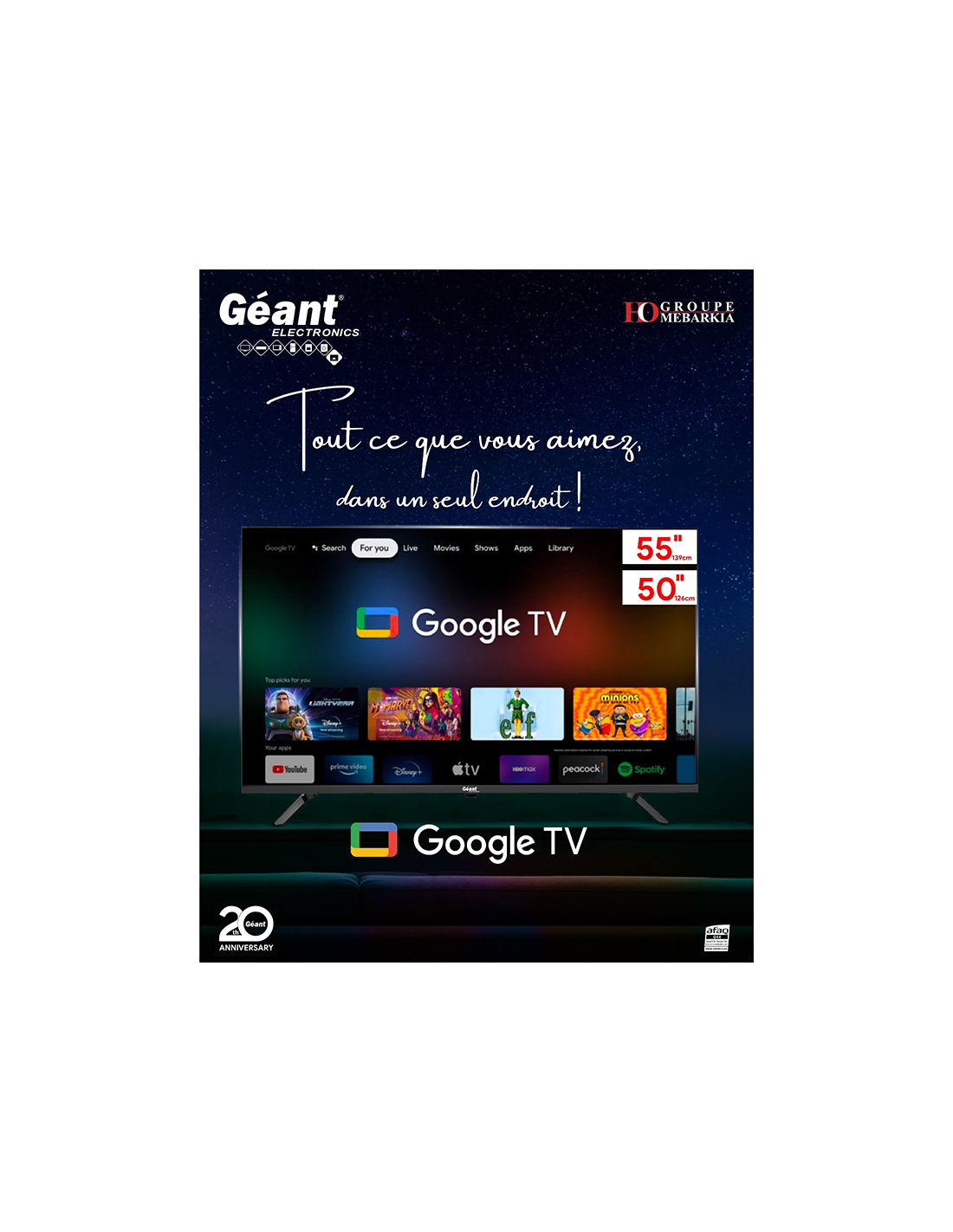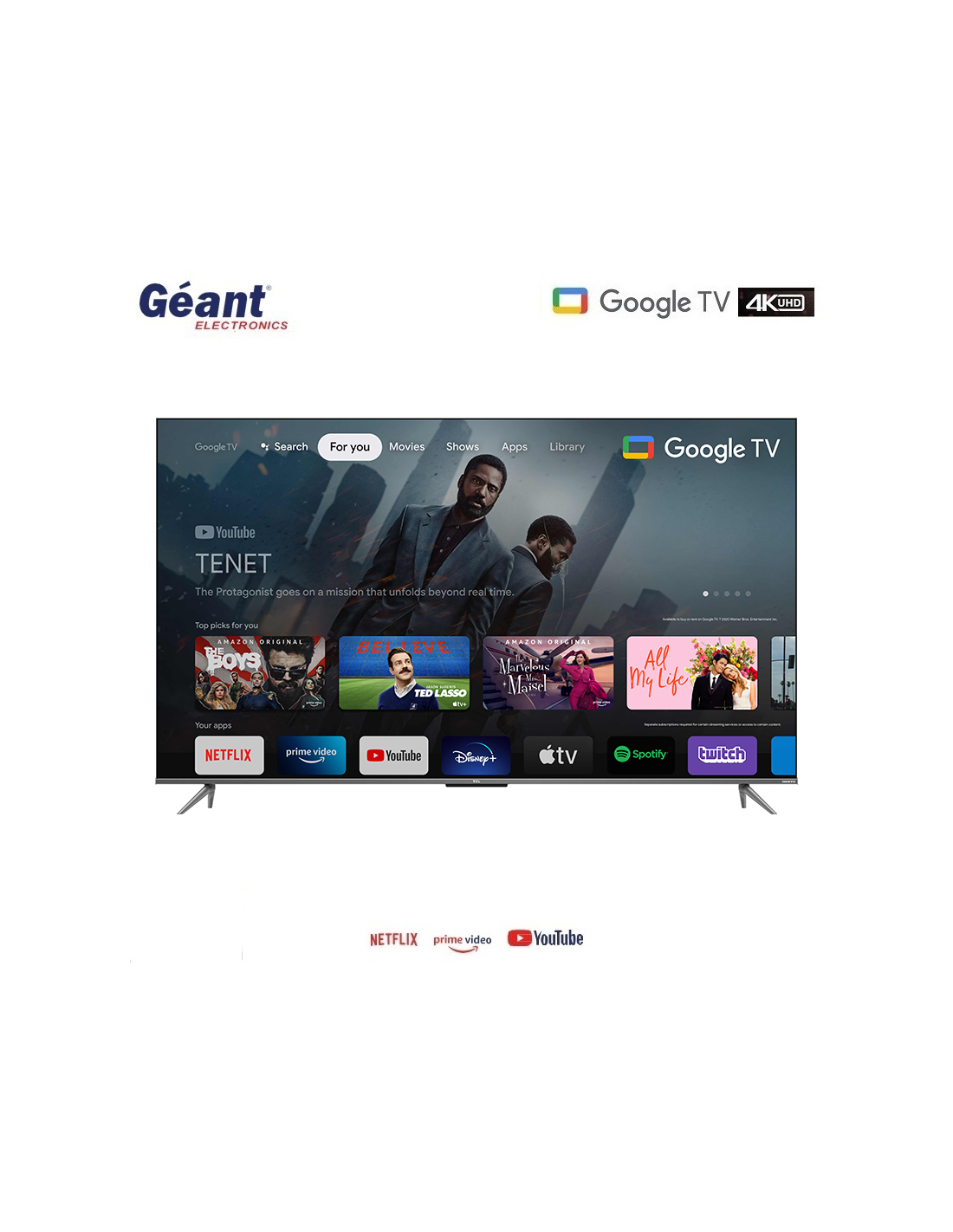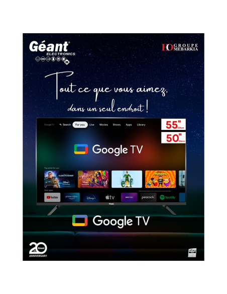 Avec Géant Electronics TV avec Google TV 55" Smart 4K UHD, vous ne perdrez pas de temps à chercher, grâce à son interface intelligente qui collecte le contenu de toutes vos applications et services préférés (comme YouTube, Netflix, Disney+, etc...) Il vous fournit des recommandations personnalisées en fonction de vos intérêts.